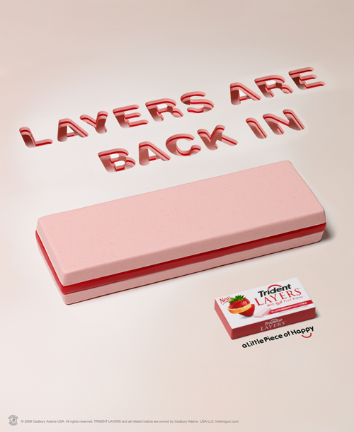 This is the launch TV and print campaign for Trident Layers—a tri-layered gum with multiple flavor profiles. The "Pay Me in Gum" launch spot heroed a father offering to pay the babysitter in gum instead of cash. What follows is an absurdist celebration of Trident Layers' irresistibility, culminating in a dejected lineman's now-iconic lament: "No one ever pays me in gum."